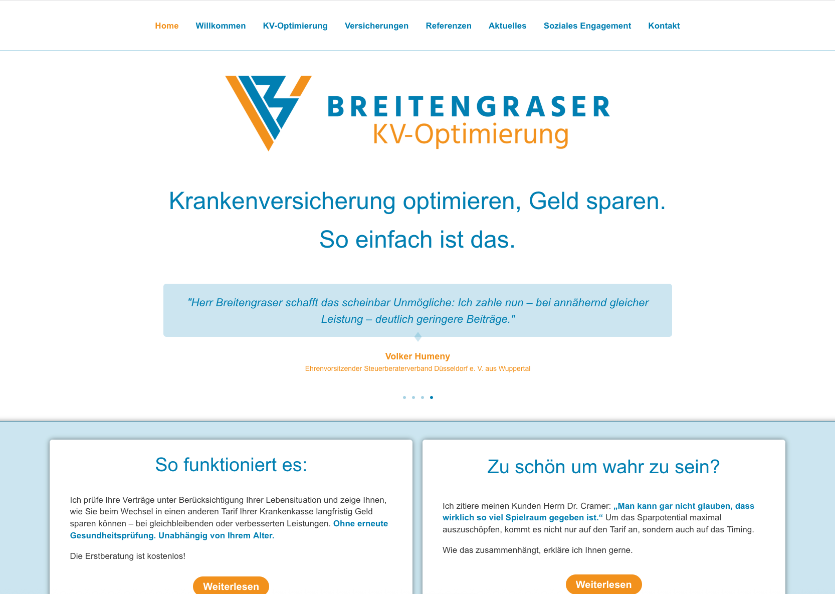 Meine erste Website in WordPress war die Seite für Breitengraser-Versicherung, also auch mein erster Kundenauftrag. Auch hier gab es eine Vorlage, die aber funktionell und optisch deutlich veraltet war. Ich habe das Design der ursprünglichen Seite als Basis verwendet, jedoch modernisiert und die Funktionalität aktualisiert.